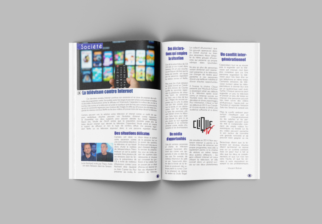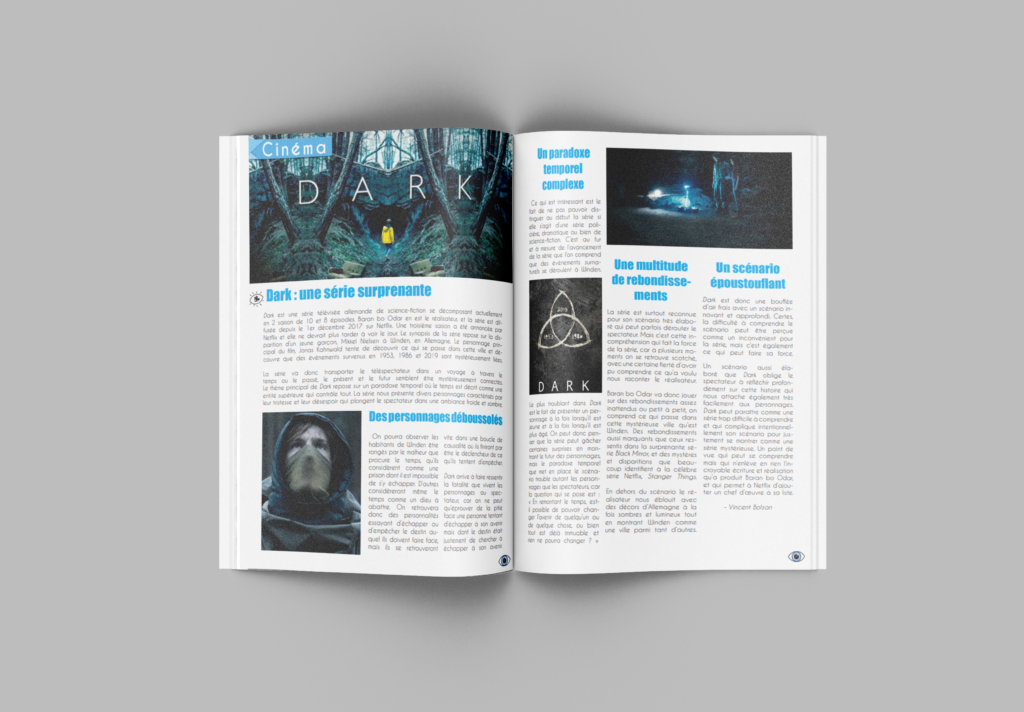 MAGAZINE Brief Voici un de mes projets print réalisés durant mon DUT MMI.Chaque élève devait réaliser 2 articles pour un magazine, et les mettre en page sur 2 pages pour chaque articles.Le premier article s’intitule « La télévision contre Internet » et le second se nomme « Dark : une série surprenante ». Détails 2 Semaines Projet d'étude Logiciels utilisés InDesign